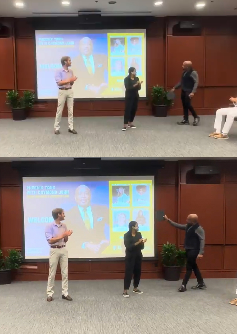 At the Doherty Center, we organized Daymond John of Shark Tank to come give feedback to 4 student entrepreneurs and their business pitches. I, alongside my friend Trinity, introduced Daymond to the packed theatre. I also assisted the entrepreneurs in their presentations. Here is Daymond showing admiration of the promotional slide that I had designed for the event.